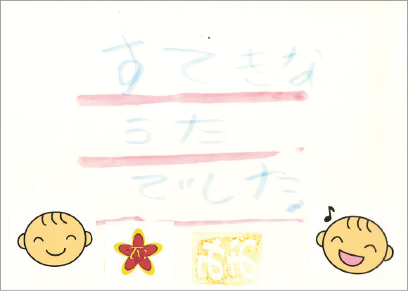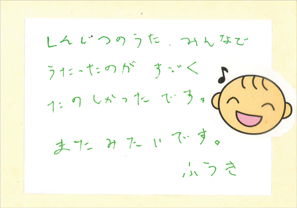 何かするためには、1人ではなく仲間と一緒にあきらめないですれば、絶対に成功するということが分かりました。みなさんの劇やダンス、歌を聞いたら、いままであったいやなことが全部ふっ飛ぶくらい、すばらしかったです。なので、私が大人になったら、劇をやりたいと思います。みなさんの心のこもった劇を見て、そう思いました。そして、私も見ている人を元気づけるような劇をしたいです。みなさんと一緒に劇をするのを楽しみにしています!