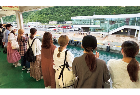 8月19日(火)、『ふたりのロッテ』カンパニーはフェリーで稚内を出発し、利尻島に到着。利尻島の鴛泊(おしどまり)港では、利尻町役場の皆様が横断幕を掲げて迎え入れてくださいました。俳優たちも船上から手を振って歓迎に応えます。船を降りた後は、フェリーをバックに記念撮影。温かな交流のひと時となりました。