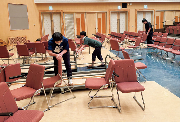 翌日21日(木)、会場の「利尻町交流促進施設どんと」では朝から舞台仕込みが始まりました。そして夕方からは俳優によるリハーサルを実施。利尻町役場の皆様も、客席の椅子を設置したり、受付を設営したりしてくださり、子どもたちを迎える準備は万端です。