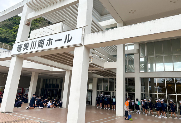 そして公演当日、徳之島町、天城町、伊仙町の3町から22校の子どもたちが来場。カモメのヒナ・フォルトゥナータと、彼女を守り育てる黒猫・ゾルバの絆の物語に夢中で観入る様子が見られ、結末を見届けた後のカーテンコールでは一体感のある大きな拍手が送られました。さらに終演後には、本公演を支えてくださった主催の皆様との懇親会が開かれ、伝統芸能の「徳之島闘牛太鼓」や「島唄」が披露されるなど、劇団と地域が心を寄せ合う素敵な時間となりました。